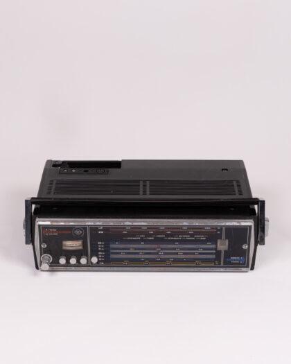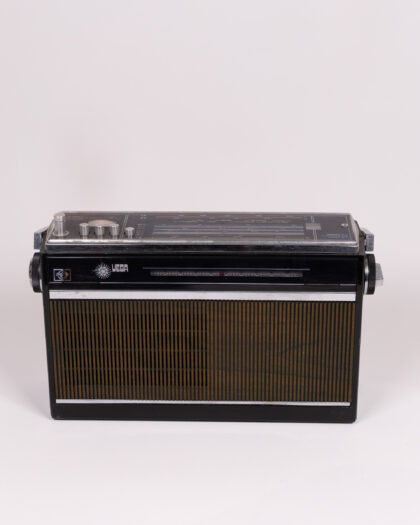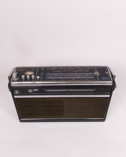 Vintage Vega portable radio. Black plastic case with a gold-coloured grille. Silver knobs, band indicator. Great decorative piece.