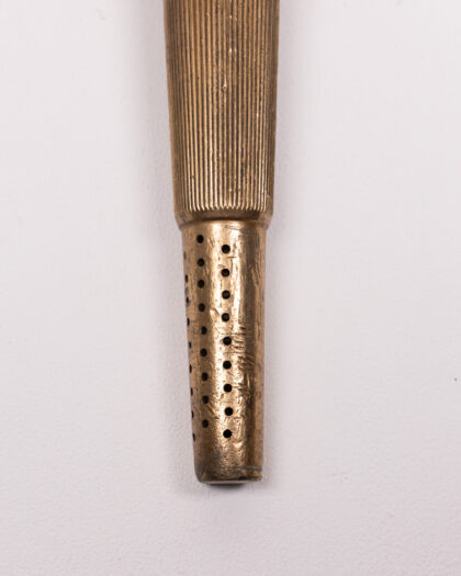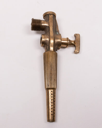 Discover this authentic vintage W. F. Flower & Co. reclaimed brass tap, a distinctive piece marked with the manufacturer's name. Crafted from solid brass, it boasts a unique ribbed design on its lower portion and a series of small holes near the bottom. The brass has developed a rich, slightly tarnished patina over time, enhancing its genuine vintage charm and character. This versatile tap is perfect for adding an authentic industrial touch to your home, whether as a striking decorative accent or as a unique component in a repurposing project. Its signs of age and use contribute to its unique story and appeal.