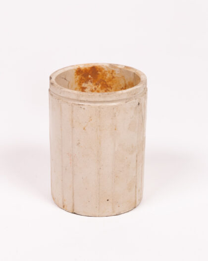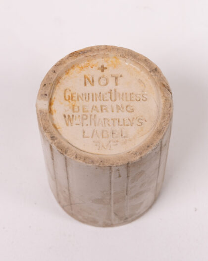 A vintage W.P. Hartley's stoneware pot, originally used for jam or preserves. The pot is made of cream-coloured stoneware and features embossed lettering around the base, stating 'Not Genuine Unless Bearing W.P. Hartley's Label.' The pot has vertical ridges. There is some discoloration. It shows signs of age and wear, including minor marks and some staining inside.