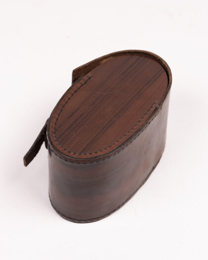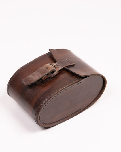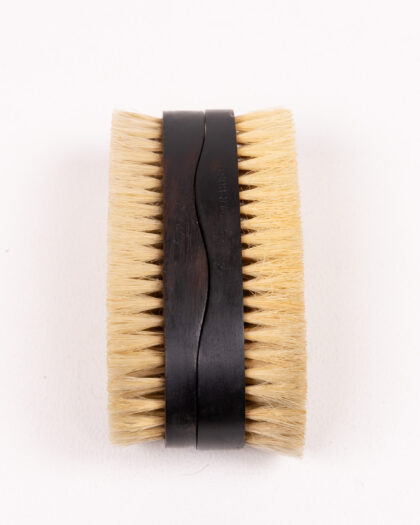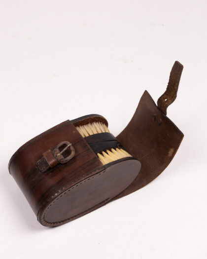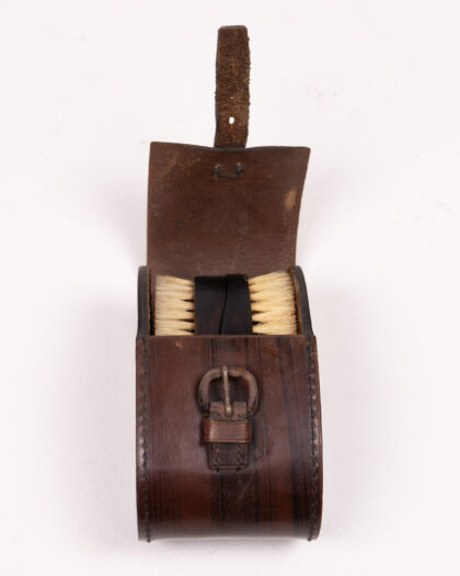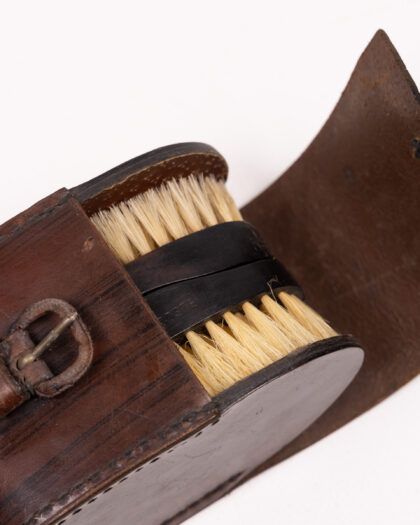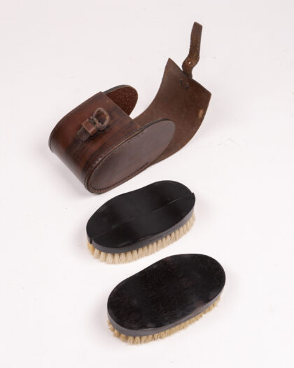 A vintage W.R. Coster leather cased brush set. The leather case is brown with a buckled closure and loop for hanging. It has a stitched construction. One brush sits on top of the other inside the case. The brushes have a black ebony back and cream coloured bristles. They are marked Real Ebony and W.R. Coster. The brushes have slight wear and the leather has some age related marks and wear but overall good condition.