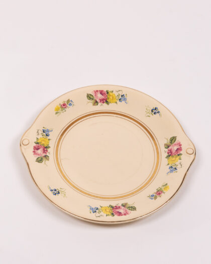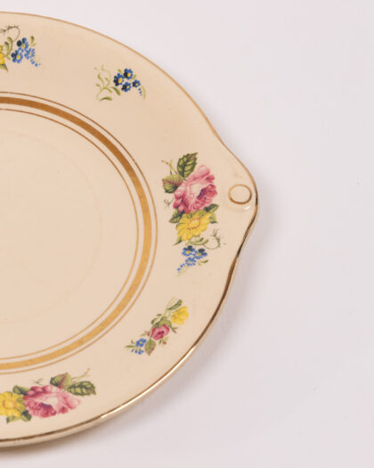 Vintage Wade England cream ceramic handled plate with gold trim and floral design.