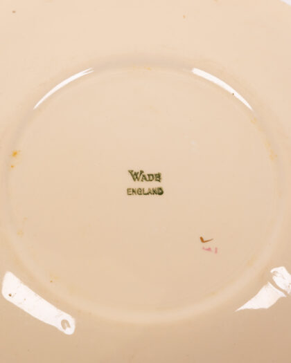 Discover this charming vintage Wade England decorative plate, a beautiful piece perfect for display. Crafted from cream-colored ceramic, it features an elegant gold trim encircling the center and along its scalloped edges. The plate is adorned with a vibrant floral motif, showcasing delicate pink roses, cheerful yellow chrysanthemums, and charming small blue flowers. Designed with two small, integrated handles on either side, it offers both aesthetic appeal and ease of handling. This piece is in good vintage condition, retaining its original charm, and proudly displays the authentic Wade England maker's mark on its base, affirming its heritage and quality.