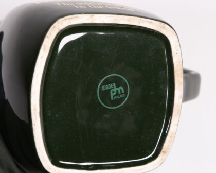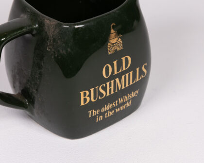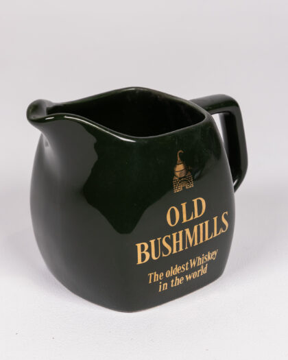 Vintage Wade Old Bushmills Whiskey Jug in dark green ceramic with gold lettering. Features the Old Bushmills Distillery logo. The jug is in good vintage condition with some signs of age. Marked 'Wade England' on the base. Perfect for collectors or as a unique bar accessory.