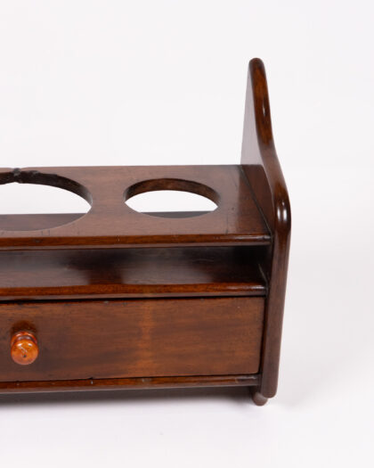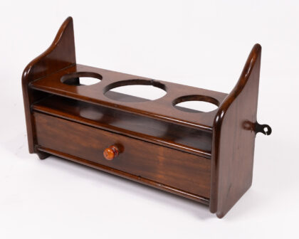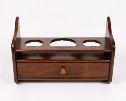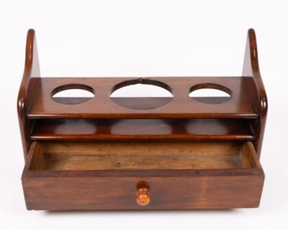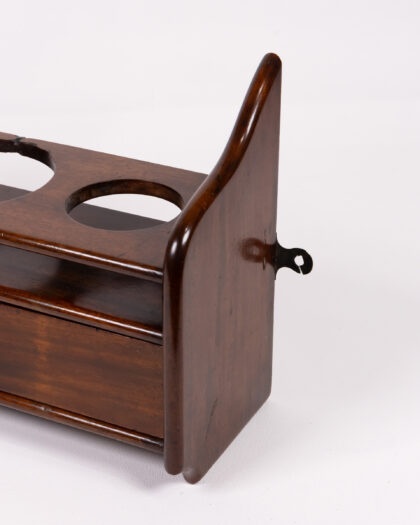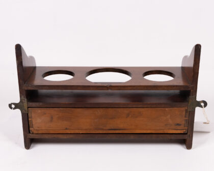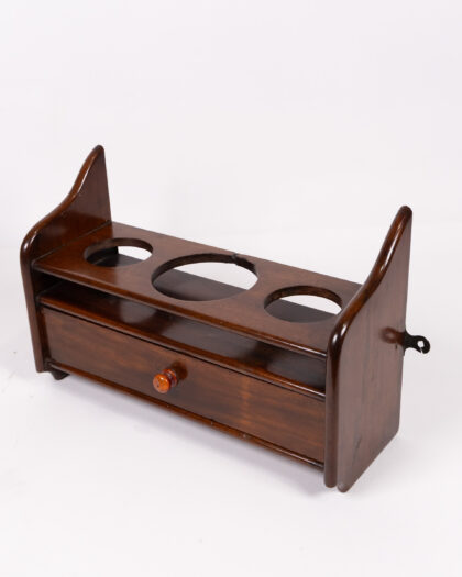 This vintage wooden liquor bottle holder combines functionality and style. It features a top shelf with three circular cutouts designed to hold liquor bottles securely. Below, a small drawer with a wooden knob offers storage for bar accessories. The dark wood finish adds a touch of elegance.