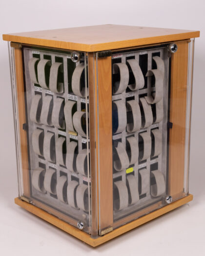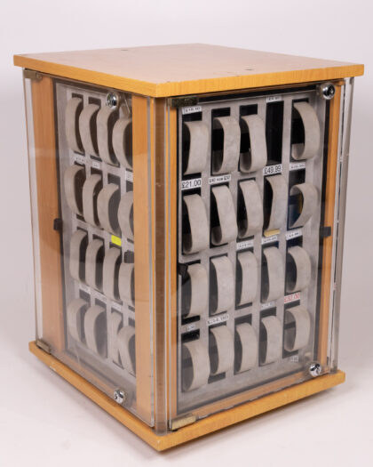 Vintage light wood framed watch display case with acrylic surround & grey rests. Great for shops, collectors, or quirky home storage.