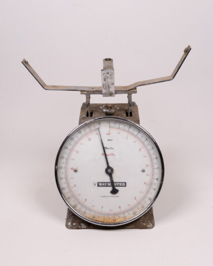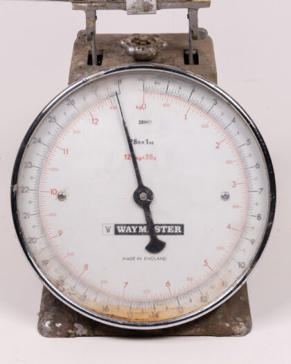 Vintage 'Waymaster' scales. This item is made in England. The item has a grey metallic base and a silver rim. The interior dial is white with black numbers. The dial measures weight in both pounds/ounces and kilograms. The vintage scales display wear and tear, marks, dirt and rusting throughout, consistent with age and use. Please see images.