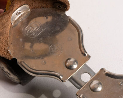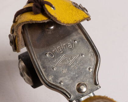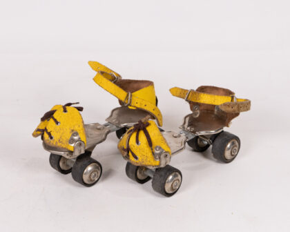 Original WECO W 100 vintage roller skates featuring yellow leather straps and laces on a metal frame with black rubber wheels. Cool for collectors!