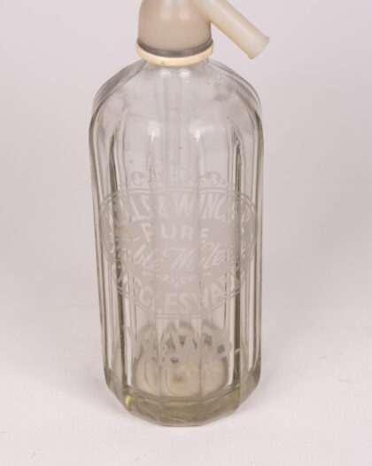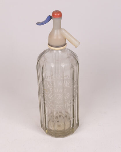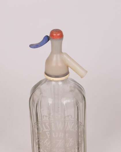 Vintage glass soda siphon featuring a red top and blue lever. Marked “Wells & Winch” – perfect for any vintage collection.