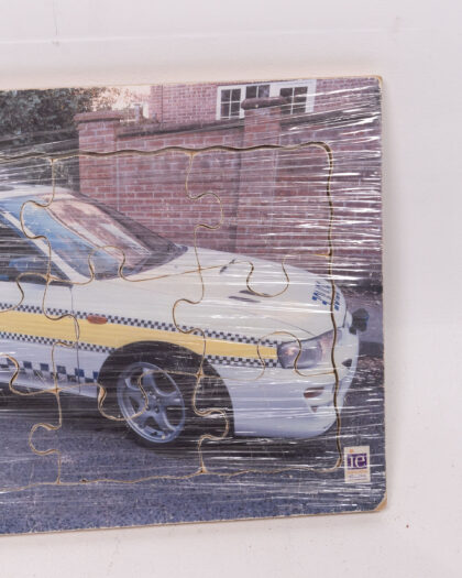 A jigsaw puzzle depicting a West Mercia Police car. The puzzle is complete and has been kept in its original plastic wrapping. The puzzle features a photo of a police car parked on a road with a brick wall in the background. A lovely gift or toy for children.