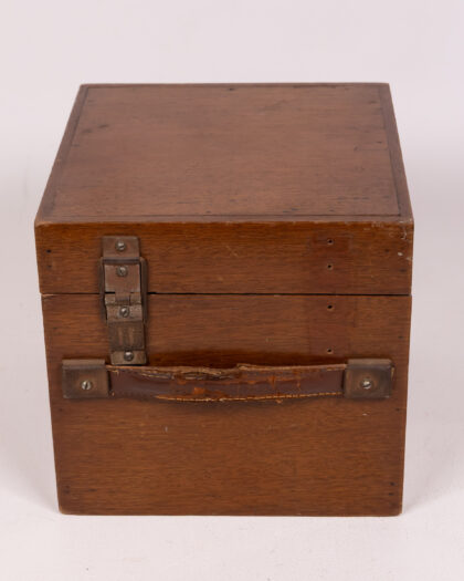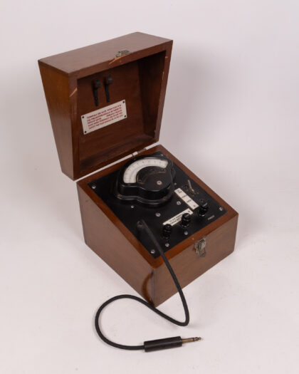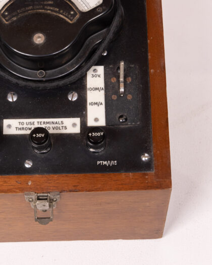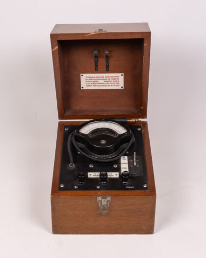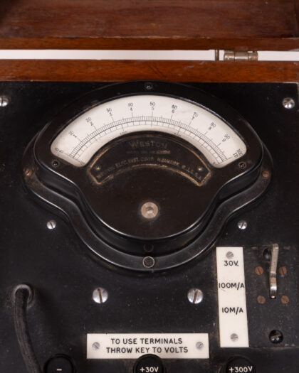 A vintage Weston Electrical Instrument Corp. Newark N.J. U.S.A. electrical tester. This analogue device is housed in a wooden box with a hinged lid and a metal latch. The front panel features various switches and terminals, along with a meter to display readings. Inside the box lid, a label provides safety instructions. It shows wear consistent with age and use, including some scratches and marks on the box and panel. The meter face is clear and readable. The connecting lead is present.
