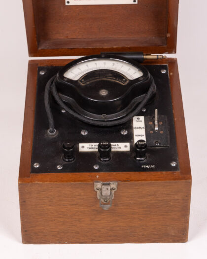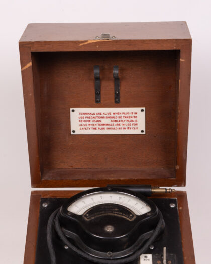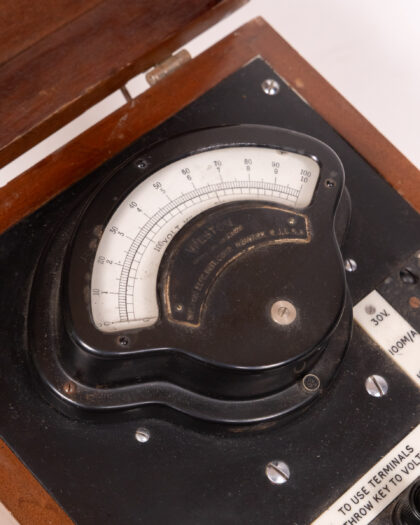Vintage Weston Electrical Tester in wooden case. An analogue device for electrical measurement, some wear consistent with age.