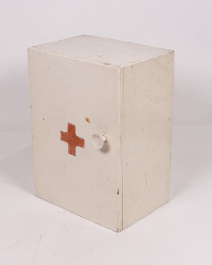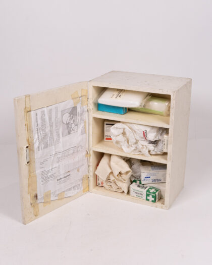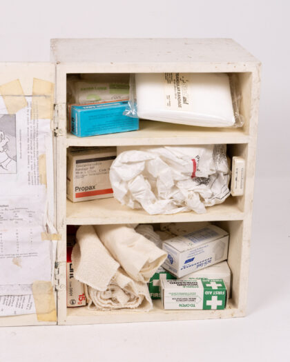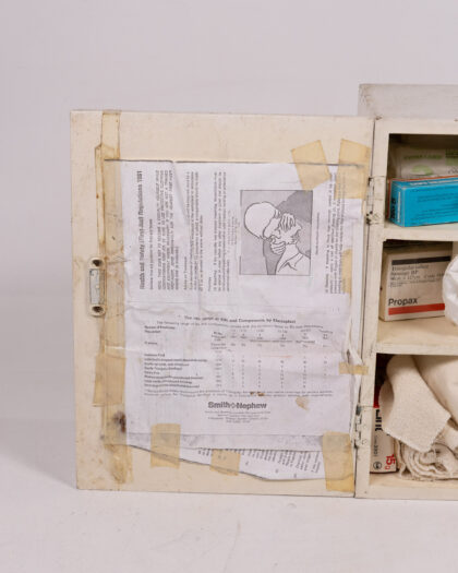 This is a vintage white first aid cabinet. The cabinet has a red cross painted on the front. The cabinet door opens to reveal three shelves containing first aid supplies. There are scratches and marks on the paint, adding to its vintage charm. Health and Safety Regulations 1981 document stuck on the inside of the door.