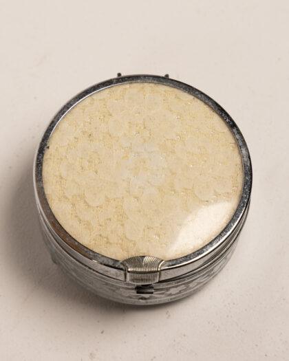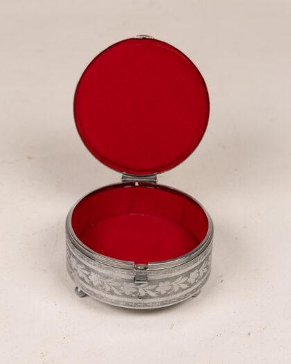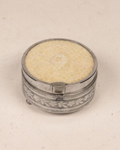 An elegant vintage silver trinket box featuring intricate floral designs.