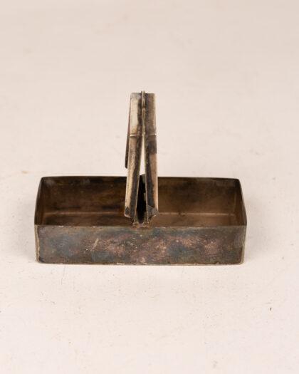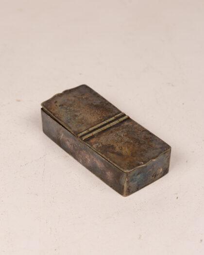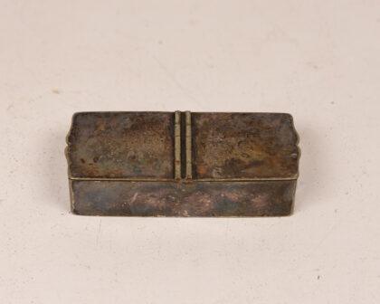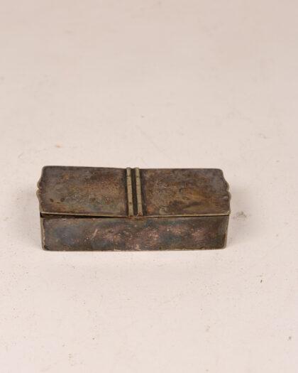 A small vintage metal box with a hinged lid, ideal for storage or decorative purposes.