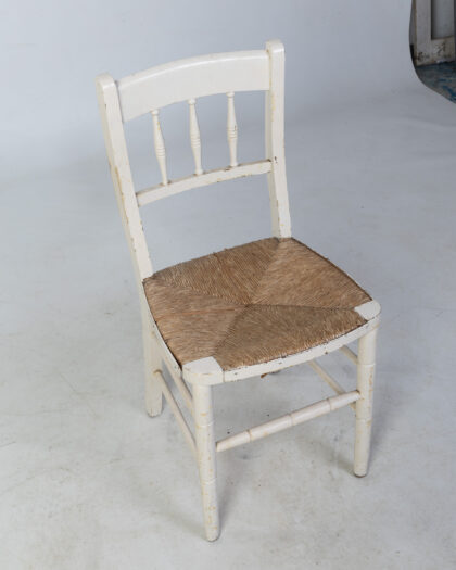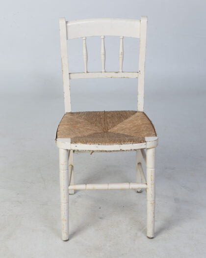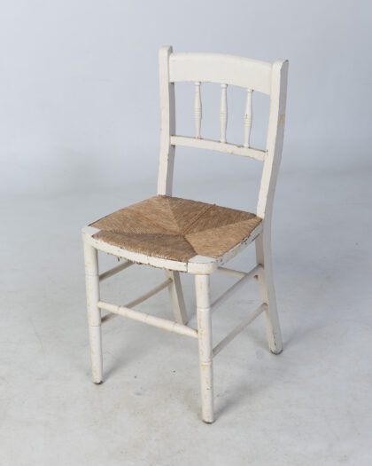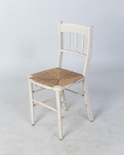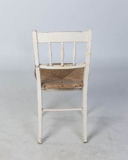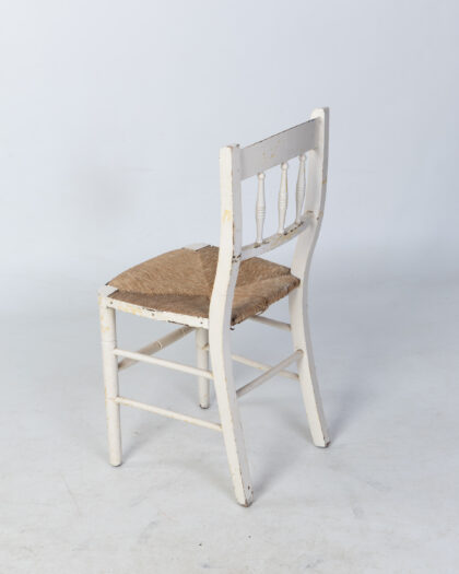 A vintage wooden chair that has been painted white. The seat is woven from natural rush. The paintwork has some wear and tear, consistent with age. This would make a lovely addition to any room, particularly a kitchen or dining room.