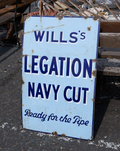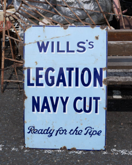 Vintage Wills's Legation Navy Cut Tobacco enamel advertising sign. Great patina, authentic vintage look, perfect for collectors or unique wall decor.