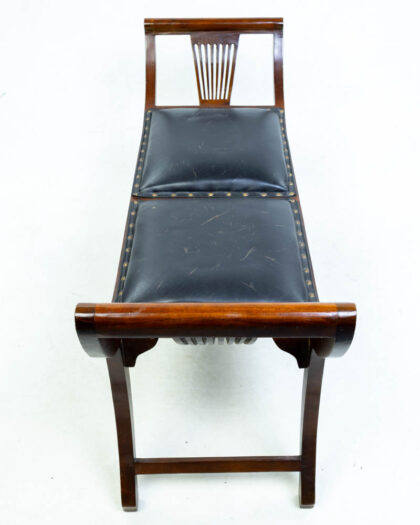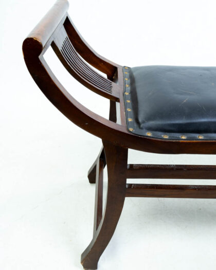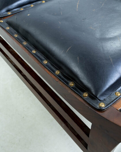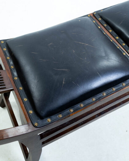 This is a vintage bench constructed with a sturdy wooden frame and a comfortable leather seat. The wood has a rich, dark brown finish. The leather is a deep black, showing wear and a few light scratches. Brass-toned studs adorn the edges of the leather seats, adding a decorative touch. This bench offers a functional seating solution and a stylish accent piece for any home.