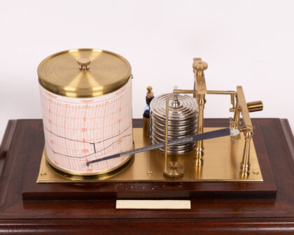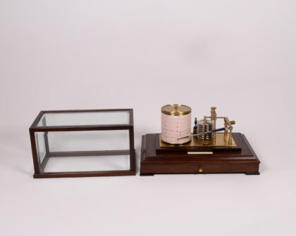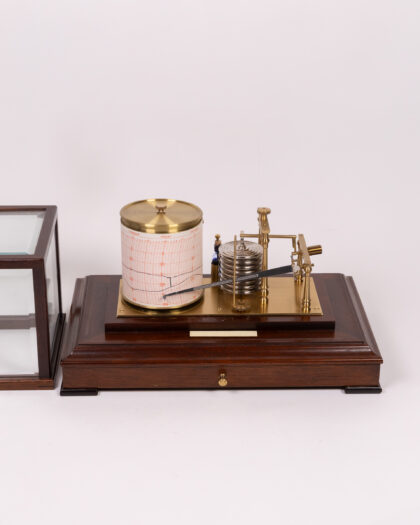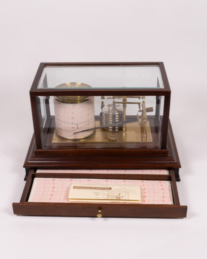 This is a cased barograph with a drawer for storing spare charts and instructions. The instrument features a brass mechanism with a series of aneroid capsules that respond to changes in atmospheric pressure. This movement is linked to a pen arm, which records the pressure variations on a chart attached to a rotating drum. The base is wooden with a mahogany finish and the instrument is protected by a glass case. There are instructions included. Untested. Sold as seen.