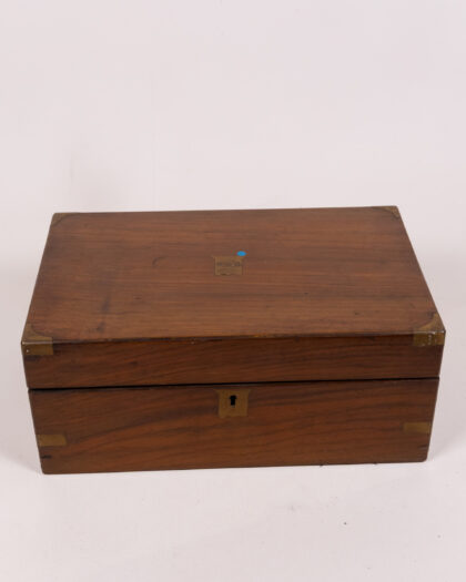 This is a vintage wooden writing slope box, featuring a hinged lid that opens to reveal a writing surface covered in what appears to be leather with a decorative gold border. The interior includes compartments for storing writing tools and accessories, and the box is lined with wood. The exterior is adorned with brass corner protectors and a central brass plaque with 'W.A.B' engraved. There is a keyhole on the front, suggesting the box can be locked. The condition of the box is fair, with visible wear and tear on the leather writing surface and some surface marks on the wood. It is a decorative storage item, ideal for a study or living room, adding a touch of vintage charm.
