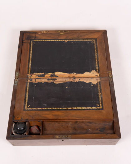 Vintage wooden writing slope box. Hinged lid, interior compartments, brass detailing. Fair condition, wear on leather. Ideal home decor.