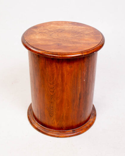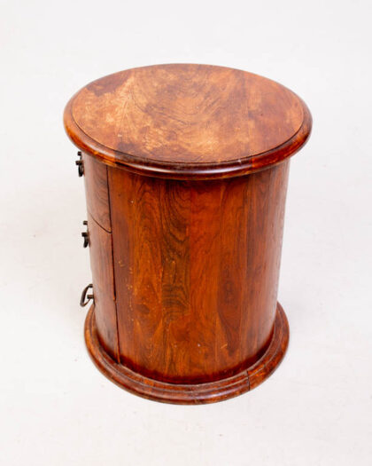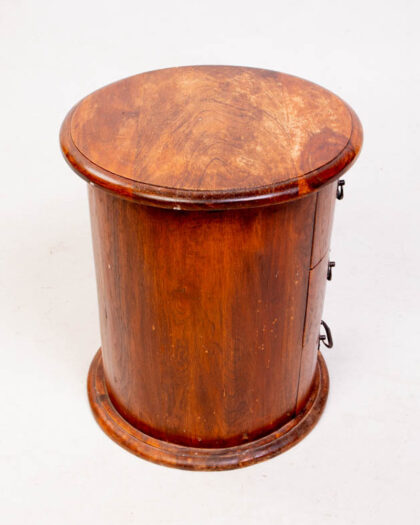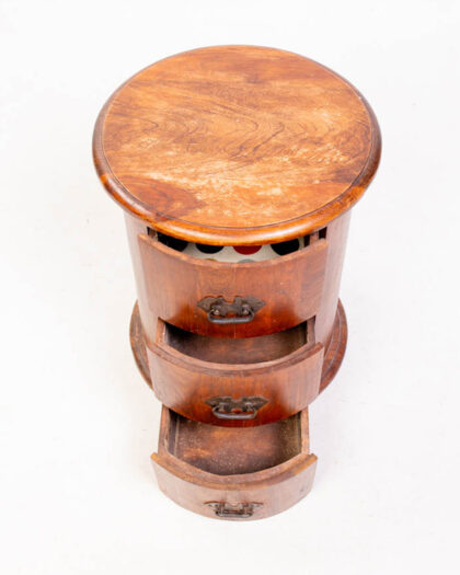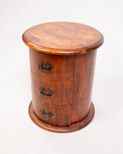 This is a vintage wooden bedside table with a round design, constructed with a curved body. The table features three drawers, each with black metal pull handles. The wood has a rich, dark brown colour. The table has a round top and a slightly protruding base. Some wear is apparent on the table top and minor scuffs on the wood. The style of the table is traditional, with a cylindrical shape and simple lines. This bedside table would work well in a bedroom, study, or living room.
