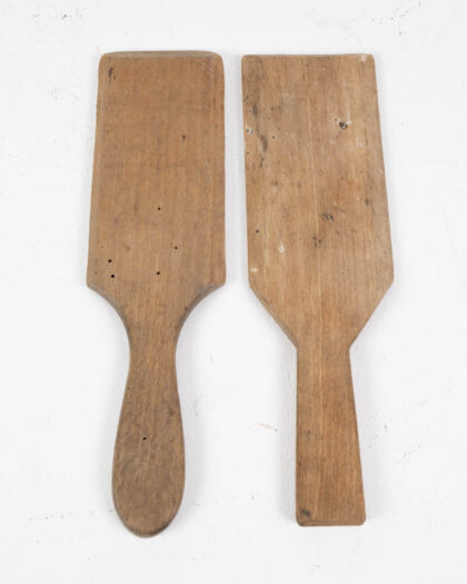 Pair of wooden butter pats. One features a rounded handle, the other a straight handle. Both have ribbed surfaces. Patina from age and use.