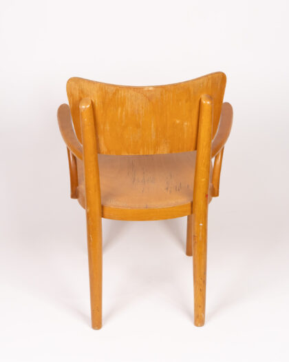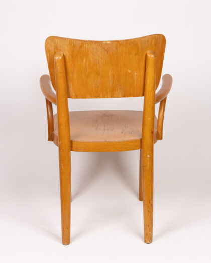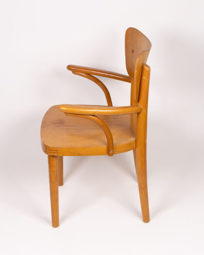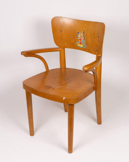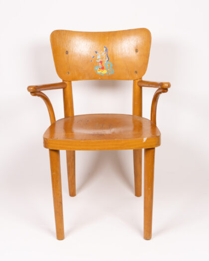 This is a vintage wooden armchair designed for children. The chair is made from wood and features a shaped backrest and armrests. There is a cartoon decal on the backrest. The chair would be ideal for a child's room or play area. The chair is in good, sturdy condition, with some signs of wear and use commensurate with age. It is a delightful piece of furniture for a child.