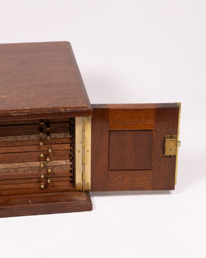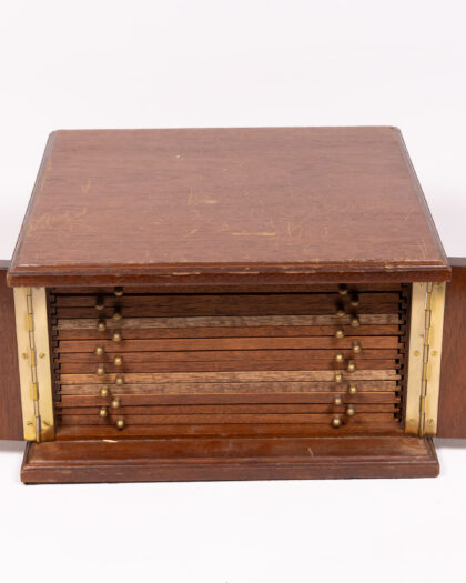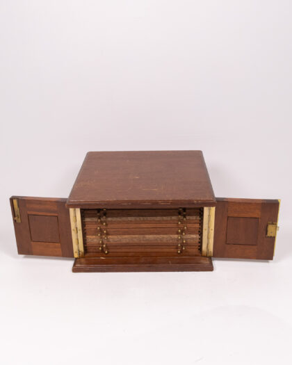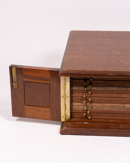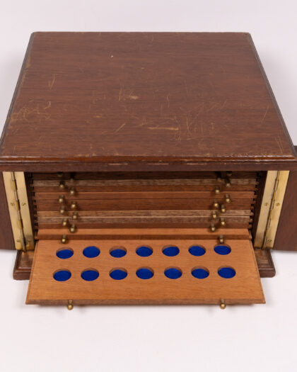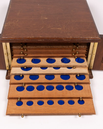 A vintage coin or collectible storage box crafted from wood with brass hardware. The box features a hinged top that opens to reveal multiple sliding drawers, each lined with blue felt and containing circular recesses designed to hold coins or small collectibles securely. Brass knobs adorn the front of each drawer for easy access. The box appears to be in good condition, but may have minor wear consistent with age and use, which adds to its character. This storage box would be ideal for numismatists, hobbyists, or anyone seeking a stylish and functional way to organize and display their collections.