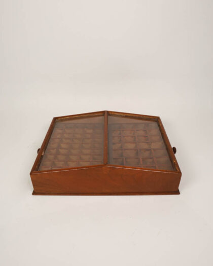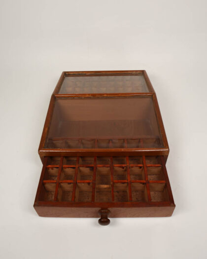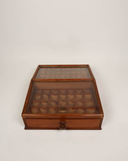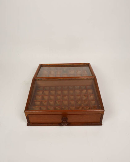 This is a vintage wooden collector's display case, perfect for showcasing small items such as coins, stamps, or other collectibles. The case features a hinged glass lid that allows for easy viewing while keeping the contents protected from dust. A pull-out drawer provides additional storage space. Inside, the case is divided into multiple compartments, each designed to hold individual items securely. The wood has a warm brown tone and the glass is clear, offering an unobstructed view of the displayed items.