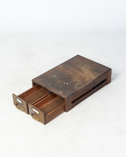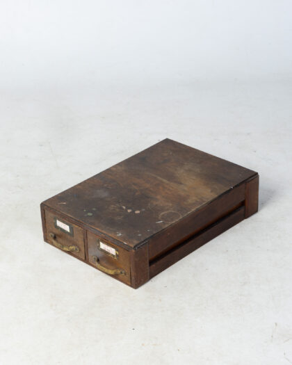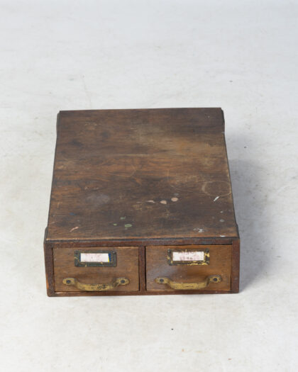 This is a charming vintage wooden cabinet featuring two drawers. It has a rustic aesthetic with brass handles and label holders on each drawer. It would be perfect for storage. The cabinet shows signs of wear consistent with age, including scratches, scuffs, and some discolouration, which add to its vintage character. Perfect for a collector or for adding a touch of vintage to a space.