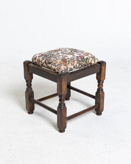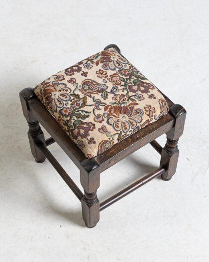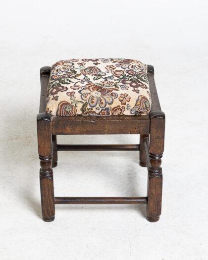 A charming vintage wooden footstool featuring a colorful floral cushion. Perfect for adding a touch of elegance to any room.