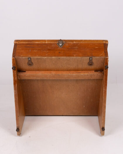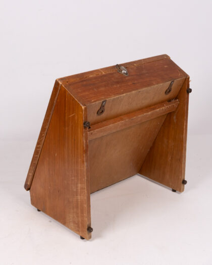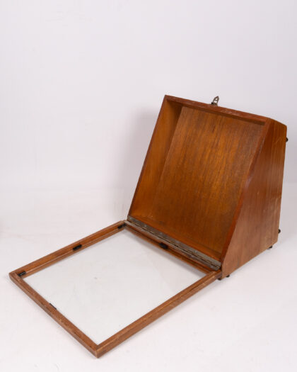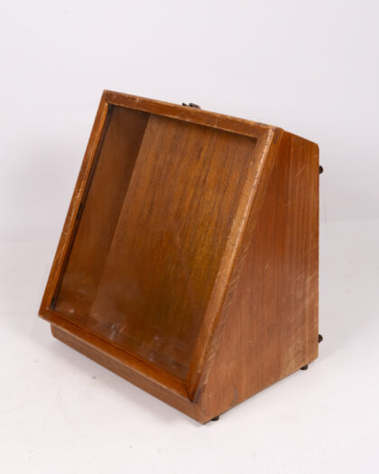 This is a vintage wooden and glass display case. It features a hinged glass lid for easy access and viewing. The case is made of wood with a light brown finish. It has a rectangular shape and a slanted front. The wooden frame holding the glass has marks consistent with age and use. There are metal hinges and a clasp. Perfect for displaying collectibles or as a unique shop fitting. It is in good vintage condition, with signs of wear commensurate with its age.