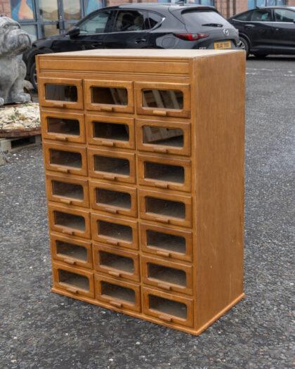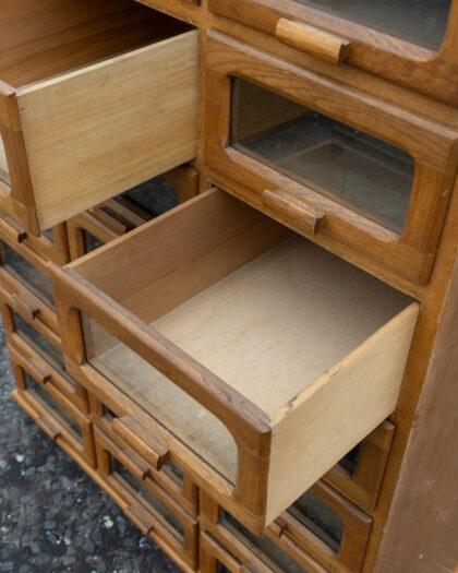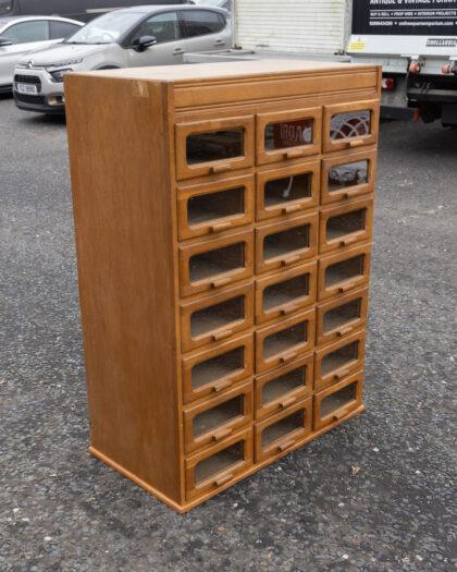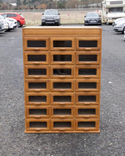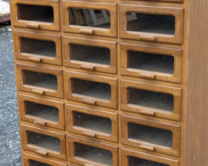 This vintage wooden haberdashery cabinet features 21 glass-fronted drawers, offering ample storage space. Perfect for adding a rustic charm to any kitchen or living area. Its unique design makes it a standout piece for both functionality and style.