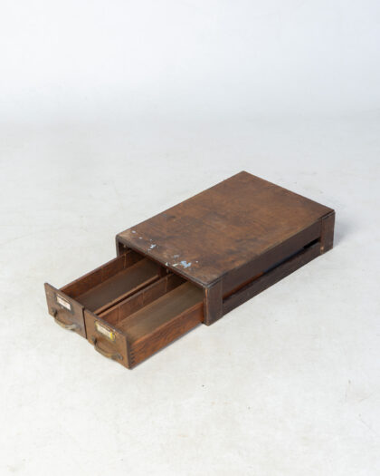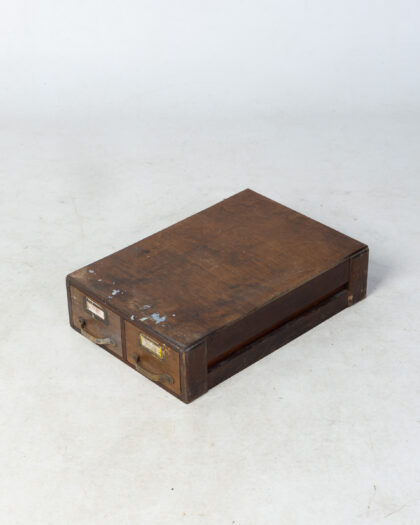 This is a vintage wooden index card file cabinet. It features two drawers, each with brass pull handles and label holders. The wood has a warm brown tone and exhibits signs of wear and age, including scuffs, scratches, and some paint remnants, which add to its vintage charm. This cabinet offers a unique storage solution for organizing cards, small items, or displaying in a home office, living room, or study. The cabinet has great visual appeal due to the aged patina.
