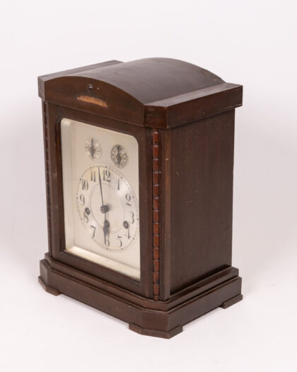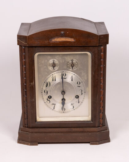 Vintage mantle clock in a dark wood case with silver face. Features chime/silent and fast/slow dials. Mechanical movement, fair condition.