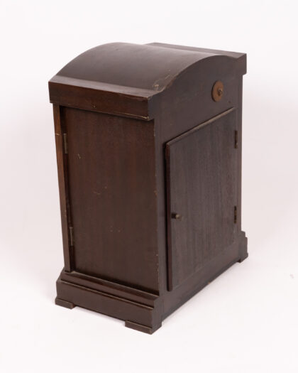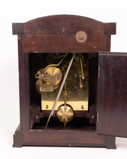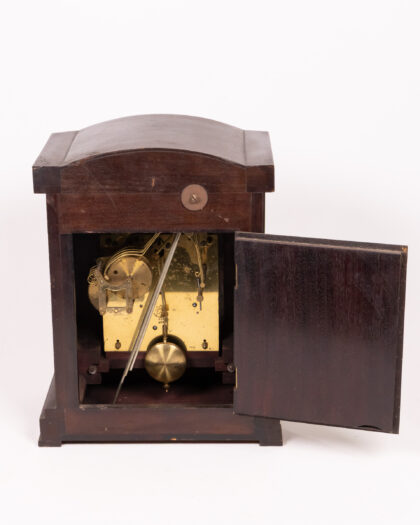 This is a vintage mantle clock. The clock has a dark brown wooden case with decorative carved details on the sides. The face of the clock is silver with black numerals, and it features two dials at the top: one for 'Chime Silent' and the other for 'Fast Slow'. A small door on the back reveals the clock's inner workings. The clock appears to be in fair condition, with some signs of wear and age to the wooden case. The clock's movement is visible through the back door, suggesting it is a mechanical or wind-up type.