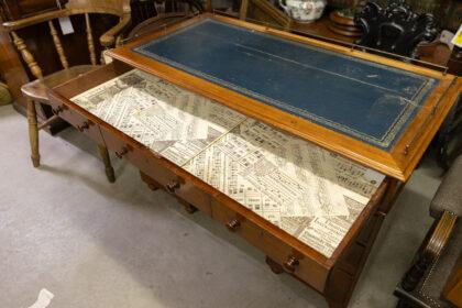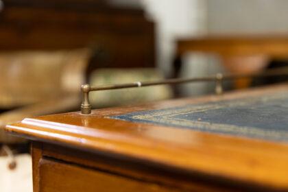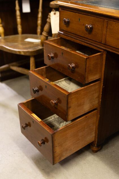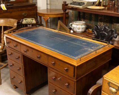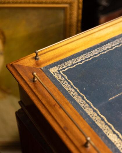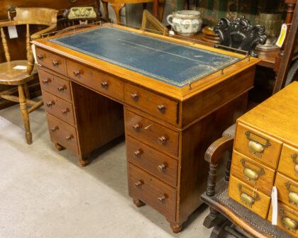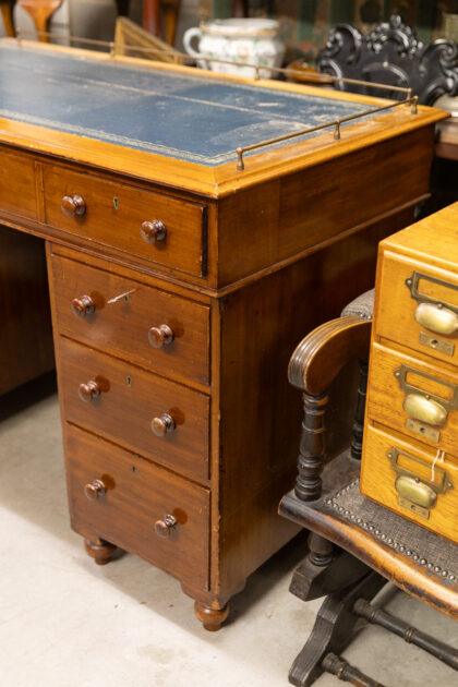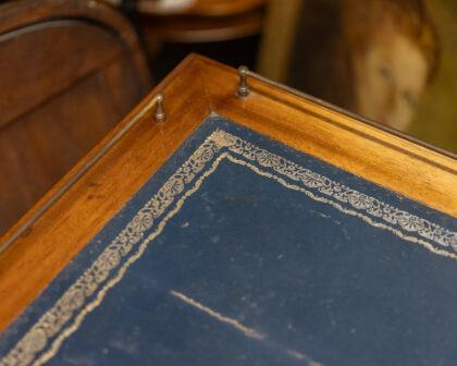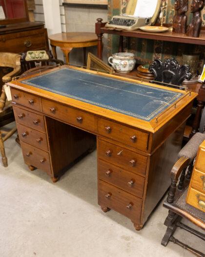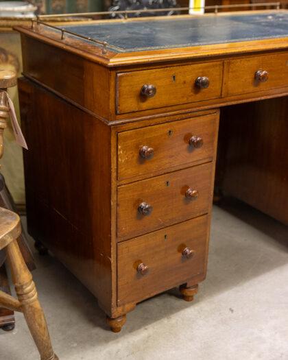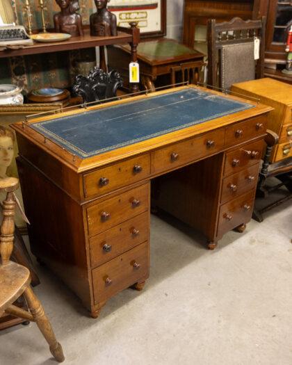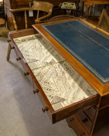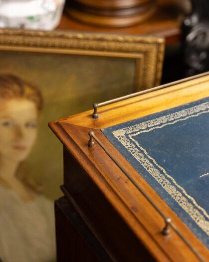 Vintage Wooden Pedestal Desk with Blue Leather Top