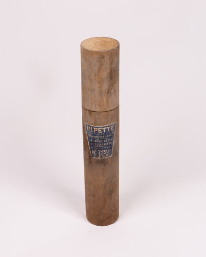 This is a vintage wooden case designed to store a pipette. The case is cylindrical, with a separate lid. The case has a blue label which reads "PIPETTE DISPOSITIF ANTI-CHOC ET PENSI-METRE COLERETTE SYSTEME CO.D.O NO 723 TER GECO". The case has a worn, aged appearance, which adds to its charm.