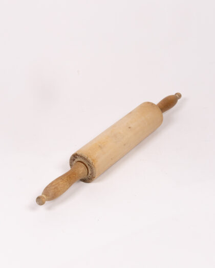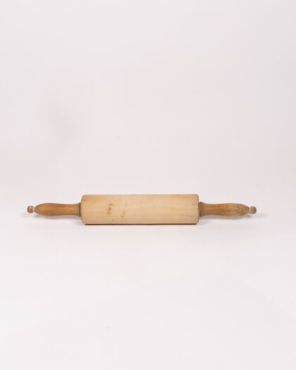 This is a vintage wooden rolling pin with a light brown, natural finish. The rolling pin features two handles, one at each end, for easy use. The wood has a smooth texture, showing signs of wear consistent with age and use, which adds to its rustic charm. Perfect for baking enthusiasts or as a decorative kitchen item, this rolling pin brings a touch of nostalgia to any culinary space. It's a practical and decorative piece of kitchenalia. Signs of wear and age present, adding to the authentic vintage aesthetic.