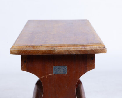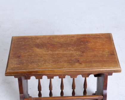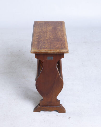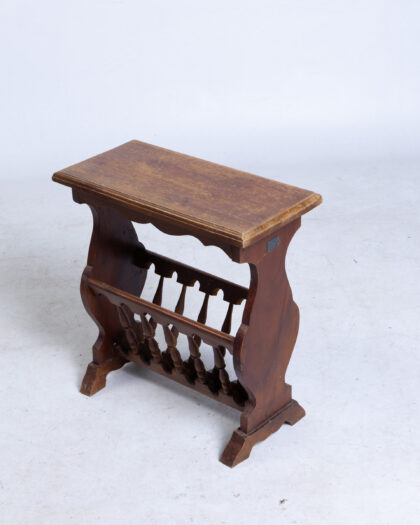 This vintage magazine rack table combines functionality with a touch of classic design. Crafted from wood, it features a sturdy tabletop ideal for displaying items or holding drinks, while the magazine rack below provides convenient storage for newspapers and periodicals. The piece showcases a warm brown tone that enhances its vintage charm. The table is in good condition, exhibiting minor wear consistent with its age, which adds to its character. This magazine rack table is a practical piece for any reading nook or living space.