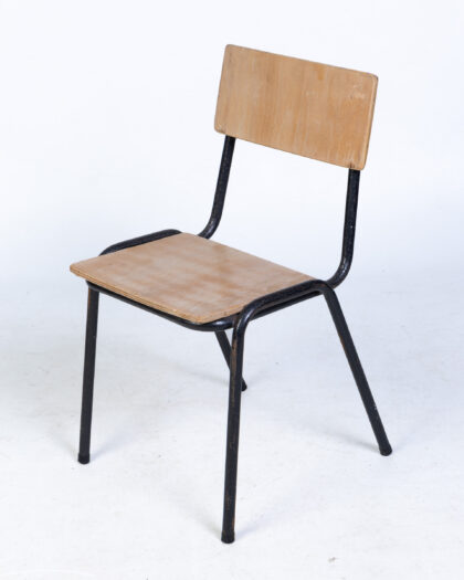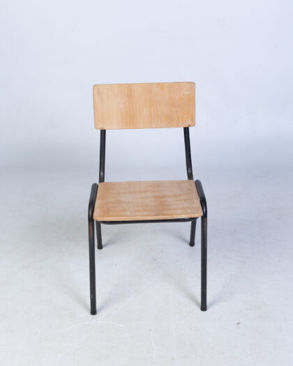 Vintage school chair with a natural wood seat and black metal frame. Perfect for adding a touch of retro charm to any room. Good condition.