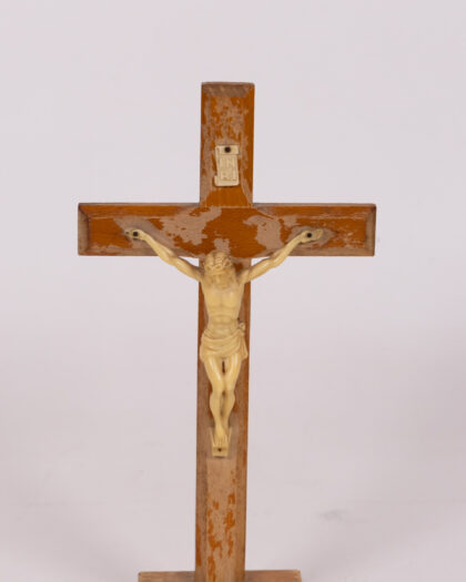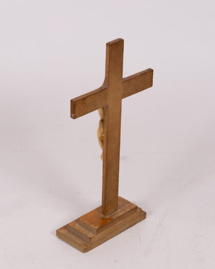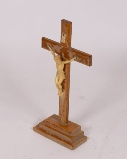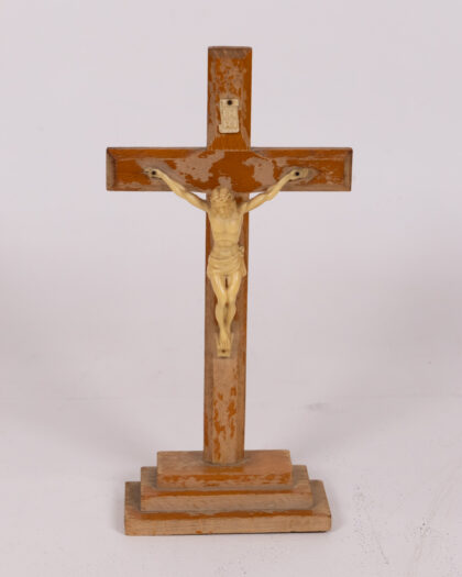 A vintage wooden crucifix featuring a light cream-coloured Jesus figure. The wooden cross is stained in a warm brown tone with some areas of lighter wood showing through the stain, revealing a rustic finish. The cross is mounted on a stepped base, which appears solid and sturdy. The "INRI" inscription is placed at the top of the cross. This crucifix stands as a testament to faith and tradition, showing signs of age that enhance its vintage charm. It is overall good condition.
