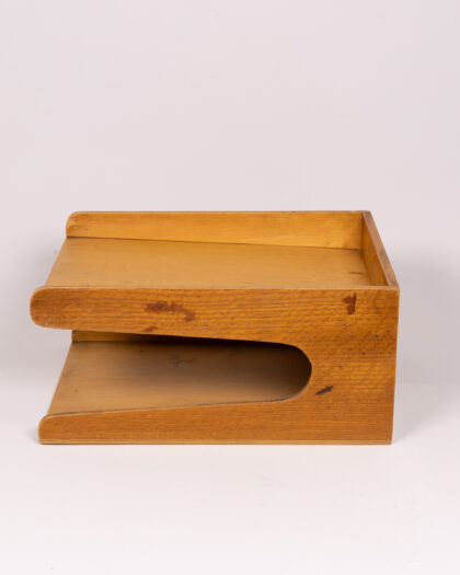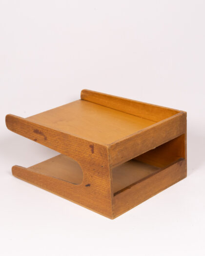 Discover this charming vintage wooden two-tier desk tidy, perfect for organizing your home office or study space. Crafted in a distinctive Art Deco style, it features elegant cut-out sides that not only add visual appeal but also allow for easy access to your documents. This versatile organiser is ideal for storing letters, bills, paperwork, or small office essentials. Its natural wood finish complements a variety of decor styles, from modern minimalist to classic vintage interiors. Presented in very good vintage condition, with only minor signs of wear consistent with its age, this desk tidy brings a touch of timeless elegance and practical functionality to any workspace.