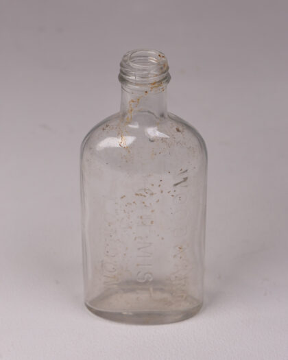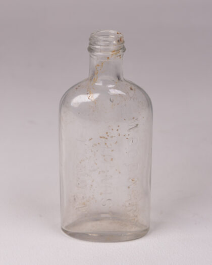 Discover this charming antique clear glass bottle, proudly embossed with 'WOODWARD, CHEMIST, LONDON'. Featuring a distinctive slightly curved, rectangular body and a narrow neck, this piece exudes historical character. The glass displays light, authentic wear, enhancing its vintage appeal and telling a story of its past. This unique bottle is a perfect find for collectors of antique glassware, vintage pharmacy items, or as a decorative accent for your home, adding a touch of old-world charm to any display.