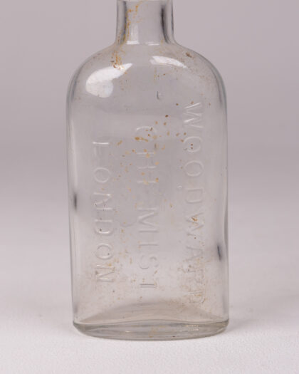 Antique clear glass bottle embossed 'WOODWARD, CHEMIST, LONDON', a unique find for collectors or vintage decor.
