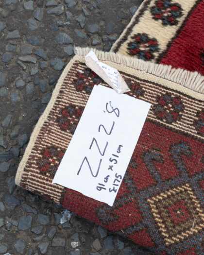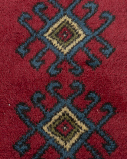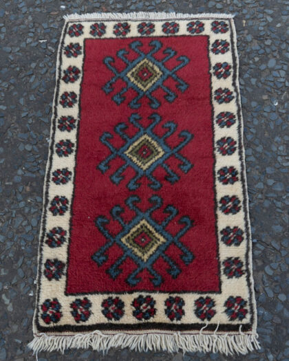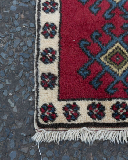 This is a vintage wool rug with a red background field, decorated with a geometric pattern in blue, yellow and white. The border is a cream colour with a repeating floral pattern in red and black. The rug has a short fringe at both ends. The rug is in fair condition, with some wear and colour variations consistent with age and use. This decorative rug would work well in a living room or bedroom.