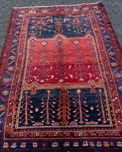 This is a beautiful vintage wool rug featuring a striking geometric design in red, blue, and brown. The rug is well-preserved. It would be a perfect addition to a living room, bedroom, or study, adding warmth and a touch of elegance. Its rich colours and intricate pattern make it a standout piece. There are some wear patterns, giving it that vintage and rustic feel.