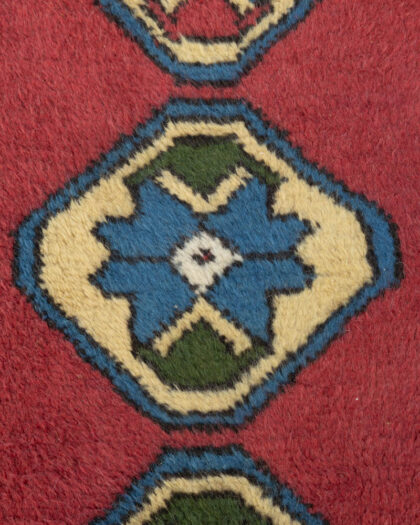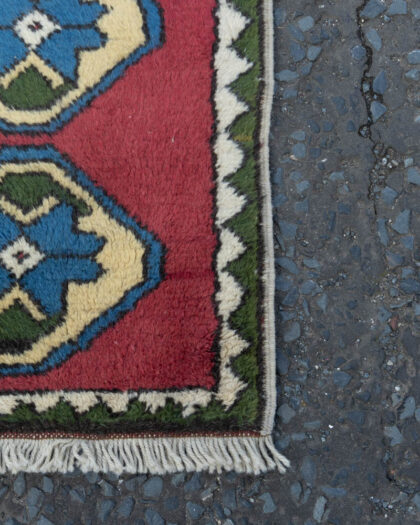 This vintage wool rug features a striking geometric medallion design. The central pattern consists of three diamond shapes, each containing a floral motif in shades of blue, green, and cream, set against a red field. A border of small triangles in cream and green surrounds the rug, finished with a cream fringe on the ends. The rug shows some minor wear, consistent with its age. It would make a colourful addition to a living room or bedroom.
