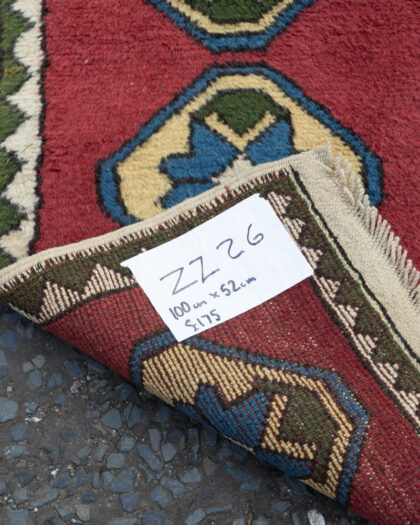 Hand-knotted wool rug with a central geometric medallion design in blue, cream and green on a red field. Fringed edges. Good condition.