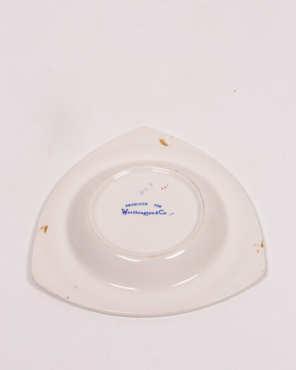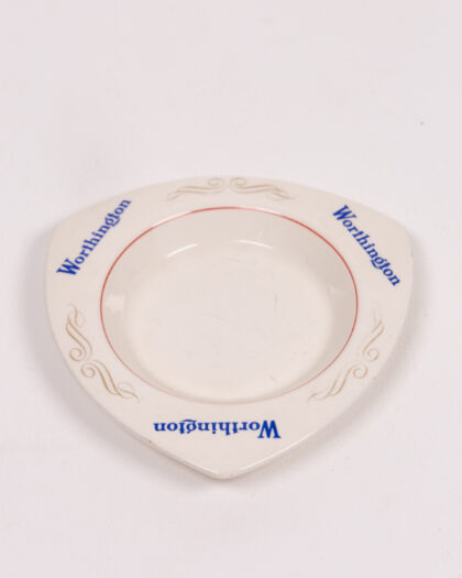 This is a vintage ceramic ashtray from Worthington Brewery. It features the Worthington logo in blue lettering around the rim. A red circular line runs around the inside perimeter. The ashtray has a unique triangular shape. A small amount of wear to the bottom.